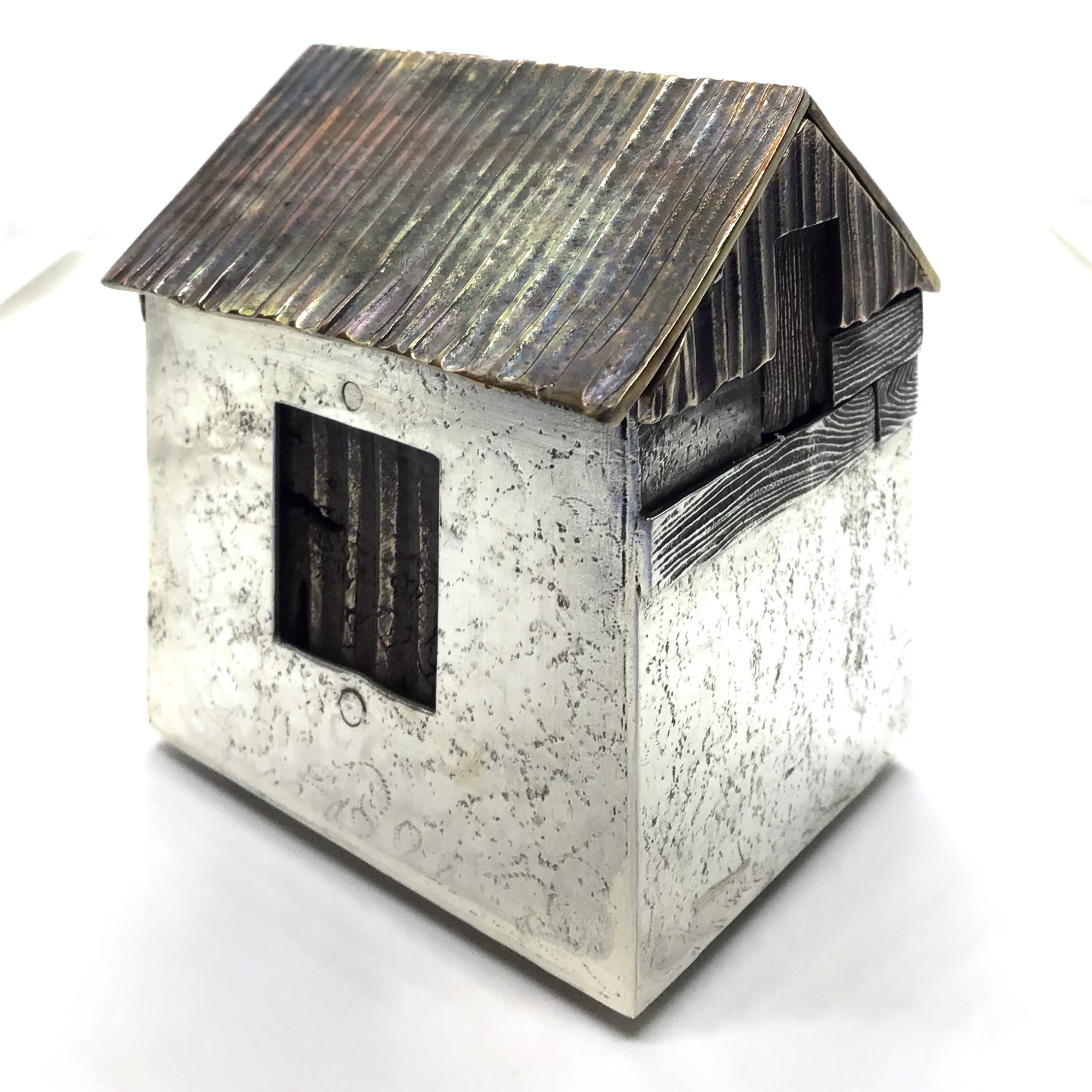 Made in recycled sterling silver and bronze, the packing shed box is the first silversmithing work I have done for many years, inspired by the many abandoned derelict small agricultural buildings dotted around the rural Devon landscape, no longer used by the small scale market garden farmers . I find the buildings both romantic yet melancholy. I have set out to create a collection of work in the shape of boxes to express the decay of these buildings.